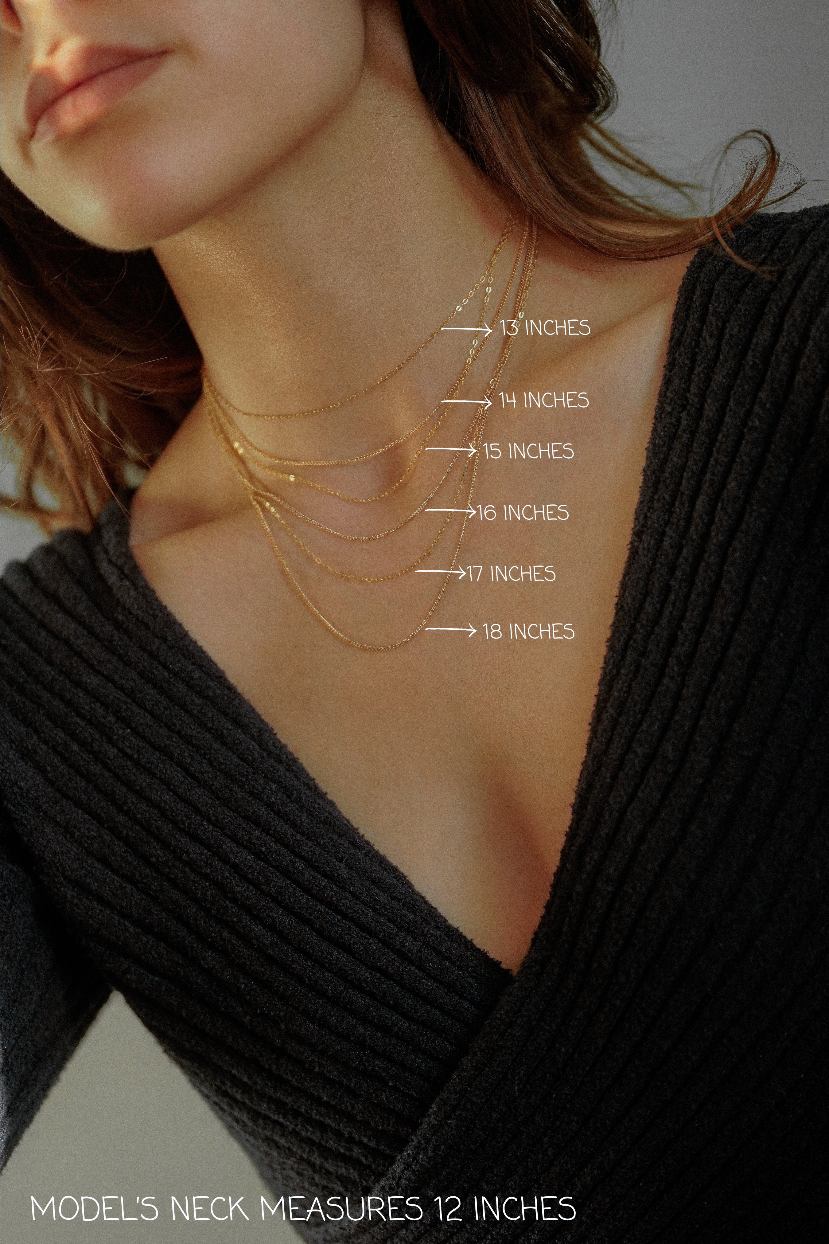 NECKLACES VARY BY CHAIN LENGTH. THE CIRCUMFERENCE OF YOUR NECK AND SIZE OF THE PENDANT WILL IMPACT HOW YOUR NECKLACE SITS ON ITS OWN AND WITH OTHER STYLES.